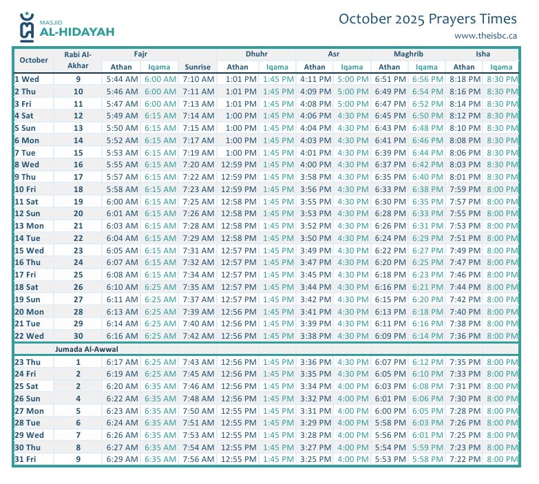 Prayers Times (Oct 1 - 30, 2025)